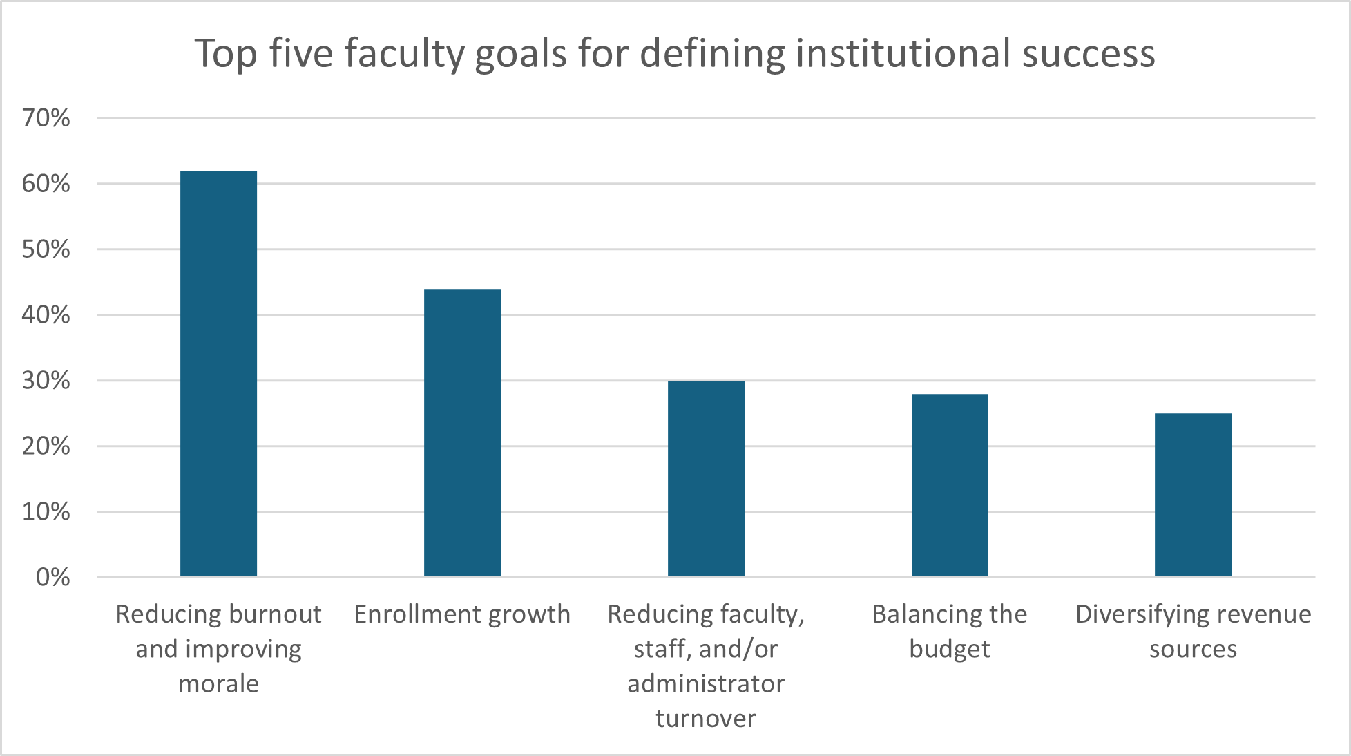 When asked to identify the top goals for defining institutional success, reducing burnout and improving morale, reducing faculty, staff, and/or administrator turnover, and balancing the budget were among the top five selections for faculty.